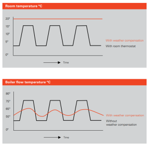 So how does it work? In short the weather compensation controls ensure the boiler burns exactly the amount of fuel required to match the heat loss from the building.